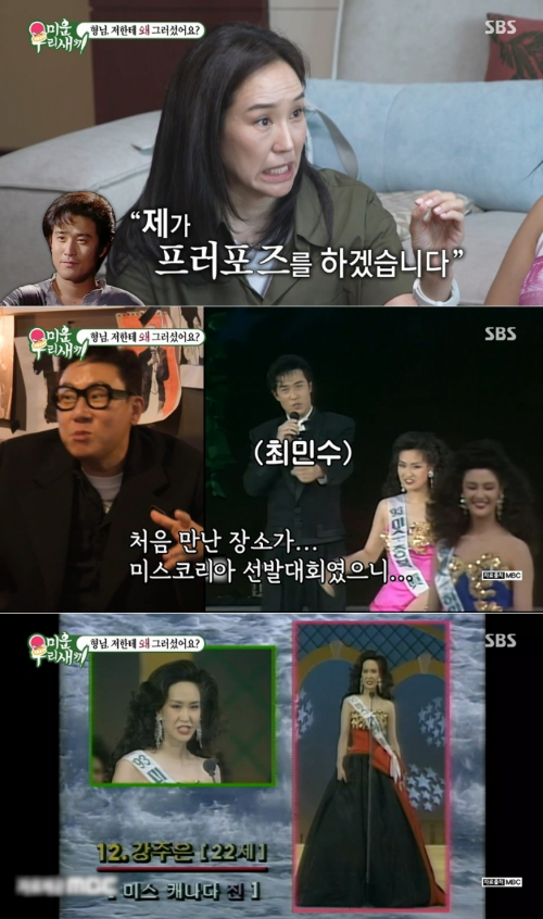 그때 강주은은 22살. 퇴장하면서 잠깐 최민수와 인사와 악수를 나눈게 다 였다고 하는데요. 대회가 있고 일주일 후 캐나다로 돌아가려는 전날 방송관계자가 관광을 제안했는데 최민수가 촬영 중이었죠. 그때 강주은을 알아본 최민수는 3시간 만에 청혼을 했어요.