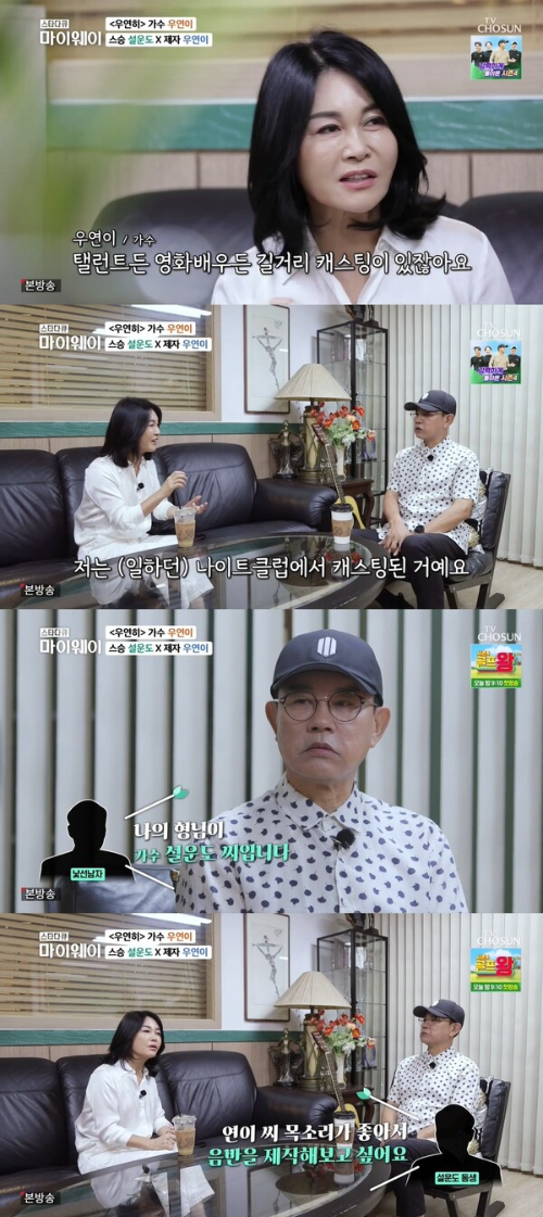 우연이는 놀랍게도 나이트클럽에서 가수로 캐스팅되었다고 하는데요. 낮선남자가 다가와 목소리가 너무 좋다며 음반을 제작해 보자고 제안을 한 것이죠. 아는 형님이 설운도라고 해서 놀랐다고. 지금은 나이트클럽에서 캐스팅되는 건 있을 수 없는 일이지만 과거에는 흔한 일이었다고 해요.