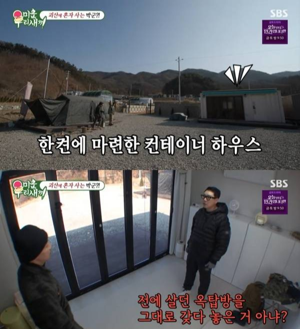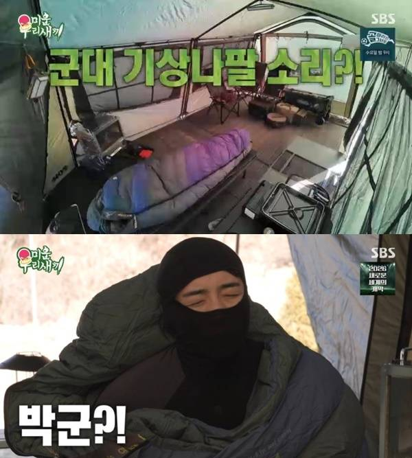 미운 우리 새기에 등장한 트로트가수 박군은 충청북도 괴산군에서 텐트를 치고 혼자 살고 있는 근황을 보여주었습니다. 텐트 속 두꺼운 겨울 침낭 속에서 잠을 자고 군대 기상나팔 소리에 깨는 마치 군대생활을 연상시키는 모습에 깜짝 놀라게 했어요. 텐트옆에슨 컨테이너집이 있어서 텐트에서 할 수 없는 것들을 그곳에서 대신했습니다.
