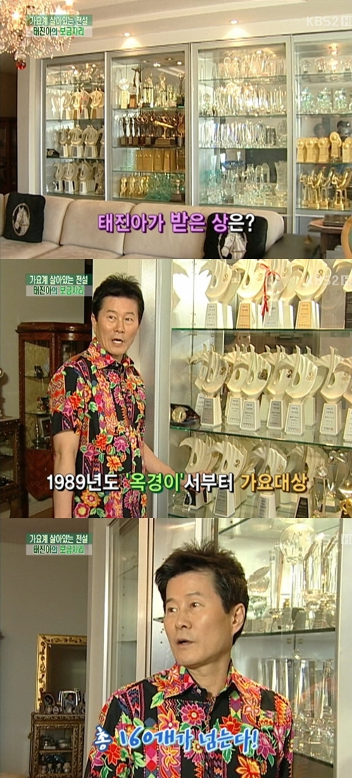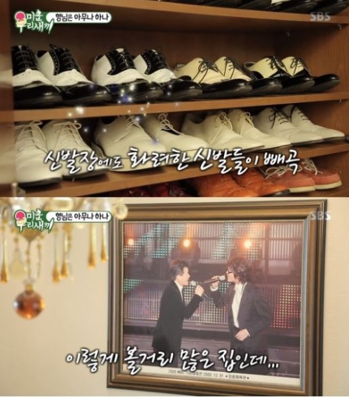 태진아 집에는 수많은 트로피를 모아 놓은 장식장이 가장 눈낄을 끌었는데요. 160개 넘는 트로피가 진열되어 있어 트로트 전설 4대 천왕을 실감하게 해 주었습니다. 무대에서 화려한 패션으로 유명한데 집안에도 수많은 반짝반짝 구두를 보여 주며 남다른 패션감각을 보였습니다.