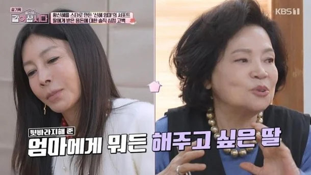 방송을 통해 황신혜 어머니가 공개되어 화제가 되었는데요. 아버지가 투병생활을 오래했는데, 딸이 일을 마치고 피곤할 텐데도 꼭 병원에 와서 아빠를 챙겼다며 효녀였다고 언급했습니다. 황신혜 어머니는 올해로 86세, 황신혜의 수익과 통장을 전부 맡고 있다고 하는데요. 사회생활하면서 돈을 벌기 시작했을 때부터 어머니께 경제권을 맡겼는데 지금까지 유지하고 있다고.