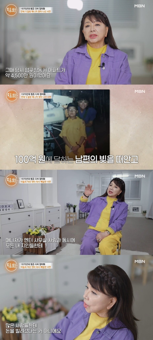 장미화는 결혼과 함께 은퇴를 했었는데요. 결혼한 지 3년 만에 이혼했다는 소식을 전했었습니다. 장미화는 결혼 후부터 인생이 힘들어졌다고 심경을 고백했는데요. 1995년에 남편의 빚이 100억 원에 달했고, 돈을 갚기 위해 당시 소유하고 있었던 4500만 원 서울 압구정동 아파트 포함해 집 몇 채가 전부 날아갔다고 해요. 당시 4500만원을 지금으로 환산하면 억대 해당하는 금액.