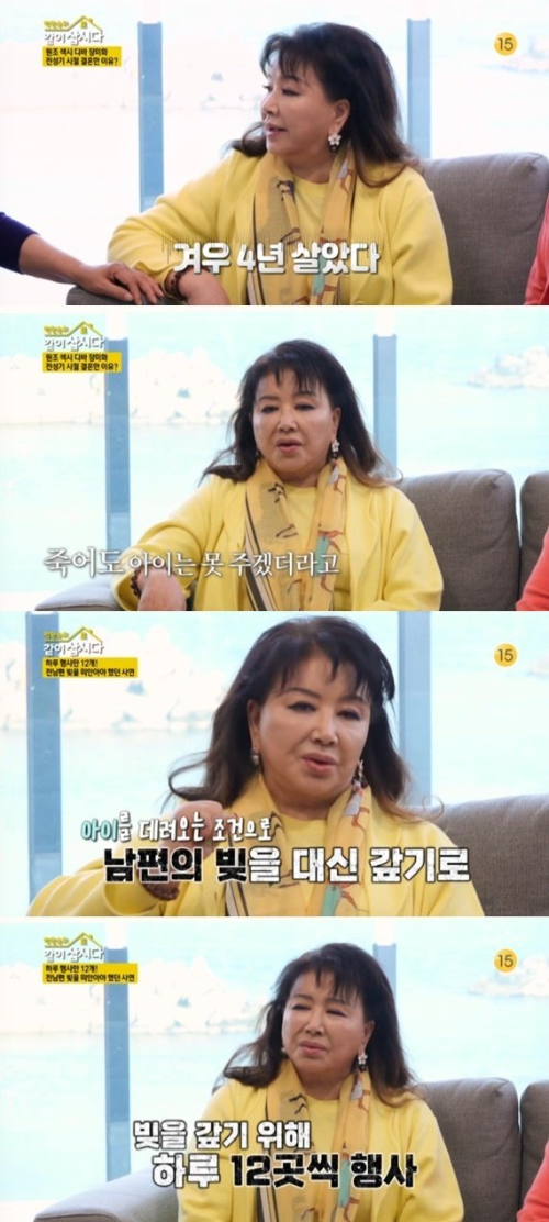 슬하에 아들 1명이 있었는데, 아들을 데려오기 위해 남편의 100억 빚을 대신 갚기로 했다고. 그 많은 빚은 갚기위해서 하루에 12곳씩 행사를 뛰며 쉬지도 못하고 제대로 먹지도 먹지도 못하고 지방행사 다 뛰었다고 해요.