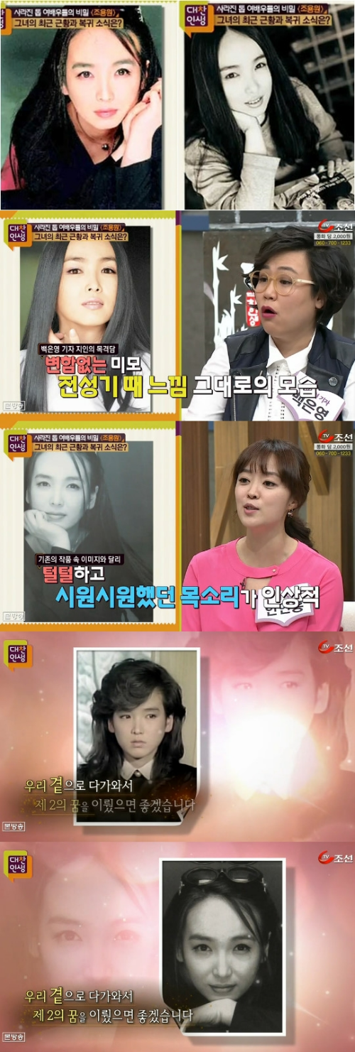 시청자의 제보로 조용원 지인을 통해 그녀의 근황을 알 수 있었는데, 조용원은 은퇴 후 한국을 떠나 다른 나라에 머물고 있고, 어머니가 편찮으셔서 병원에 있다는 소식을 들었다며, 배우 조용원은 이제 방송을 떠났기에 외부에 노출되는 것을 꺼린다고 전했어요.
